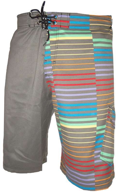Angry Minds Real Deal Board short with horizontal rainbow stripes and a side leg pocket. Also, this boardshorts waist is half fitted, half elasticated for comfort. velcro and tie up fly. Polyester. Sizes 102-127 with sizes 117 & 132 sold out.