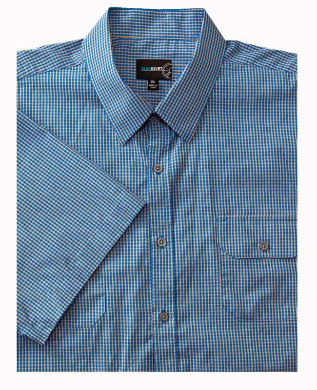 Blue Rivet window check short sleeve shirt with twin chest pockets. Made of Cotton/ Polyester. Nb. The "Black" colour is actually black and blue checks. See photo.