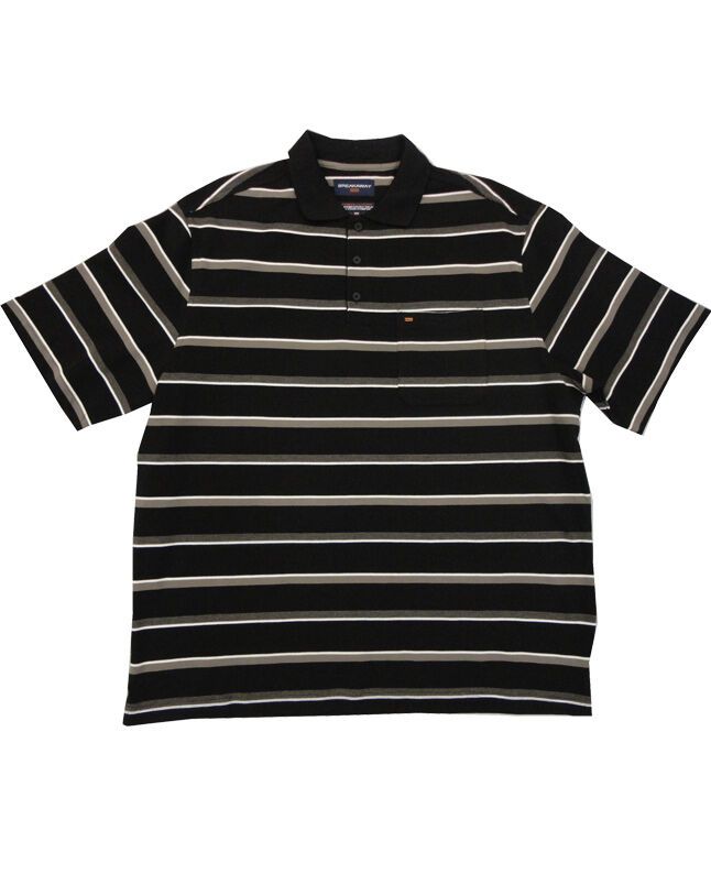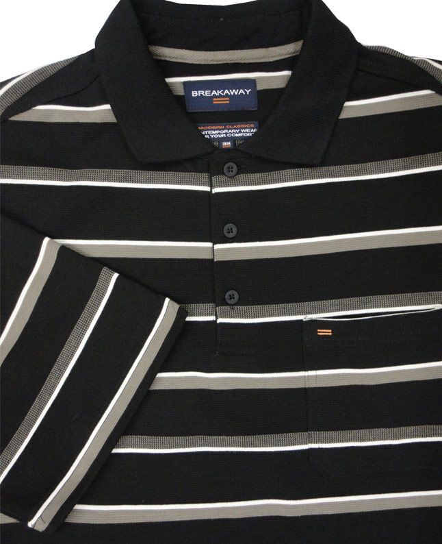 Breakaway contemporary fit, striped pattern, polo shirt with single chest pocket and three button collar. Made of cotton/polyester blend.