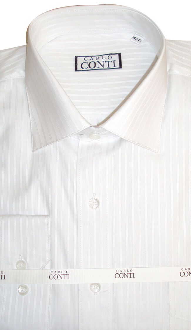 Carlo Conti white ribbed ong sleeve with collar attached and made of 100% cotton. Featuring two piece collar for smartness and comfort, top fused collar for neatness and long life, high quality easy-care fabric, top fused cuff with two buttons cuff for personalized fit, top fused placket, tailored sleeve plaque, pleated cuff, pocket, top fused single needle armhole and side pleats on back yoke.