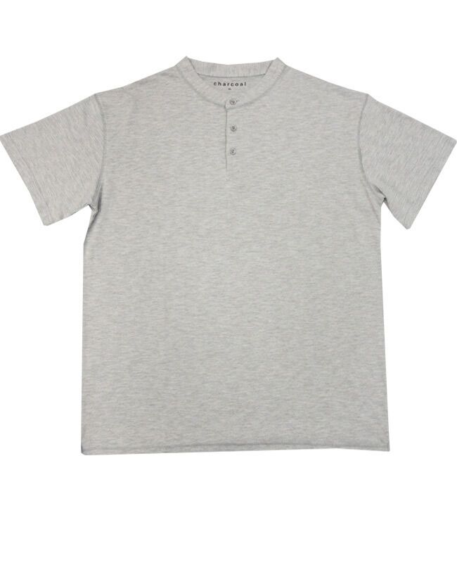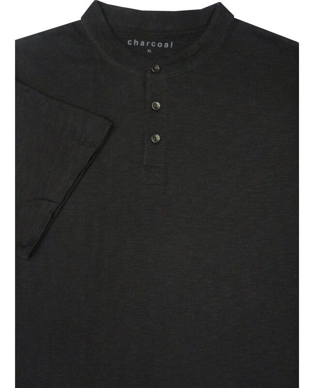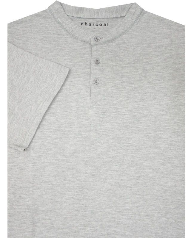 Charcoal henley short sleeve 3 button shirt. No pockets. Made of 65% Cotton and 35% Polyester.
