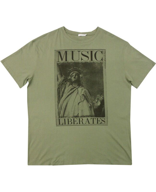 Charcoal music liberty short sleeve t-shirt with large print on chest. Made of 60% Polyester and 40% Cotton.