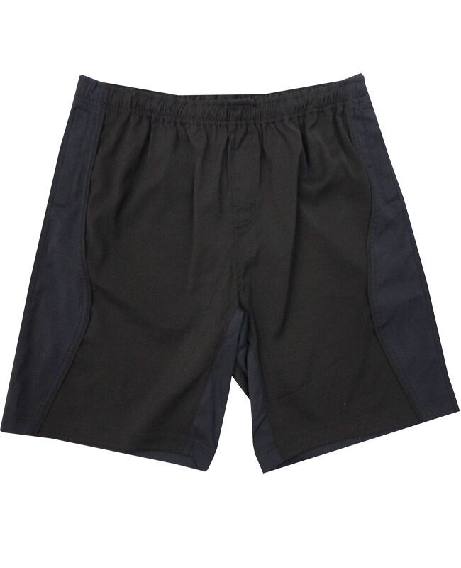 Charcoal boardies made of 98% Polyester and 2% Spandex that features two waist side pockets, one back pocket, elastic waist, drawstring and NO mesh insert or fly zip.