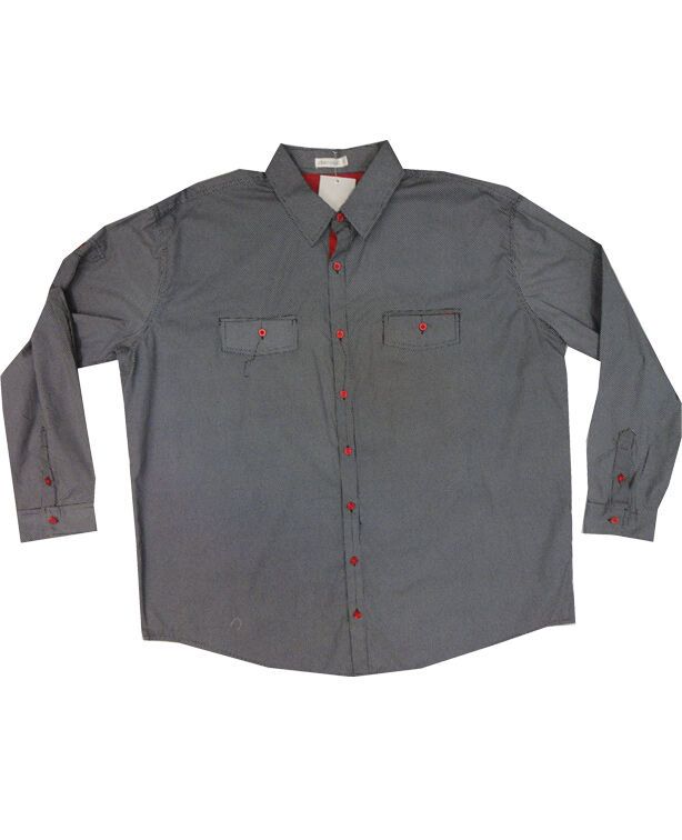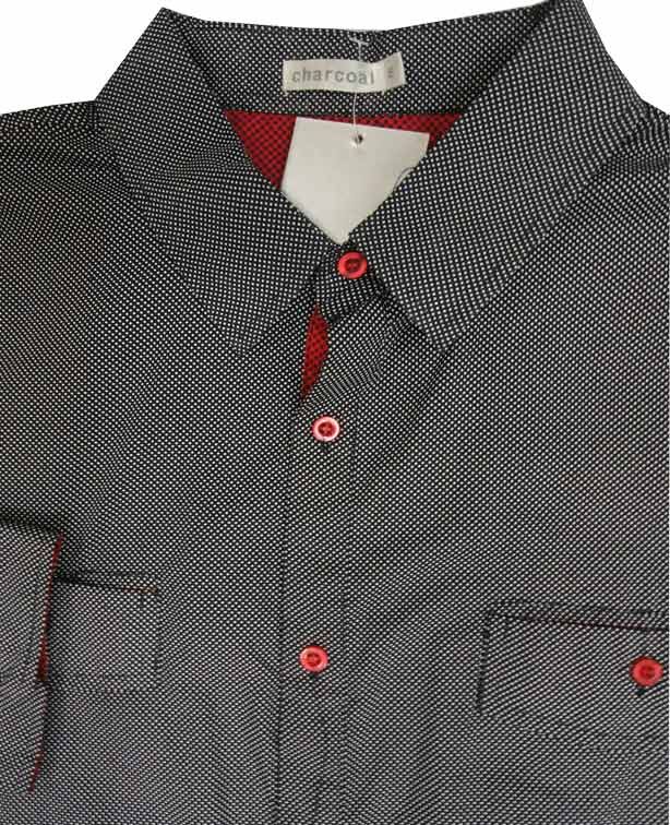 Charcoal long sleeve shirt with vivid red buttons, two chest pockets and single pocket on sleeve. Made of 100% cotton.