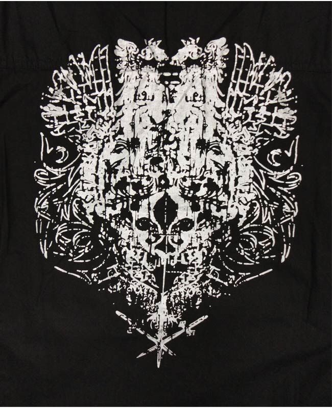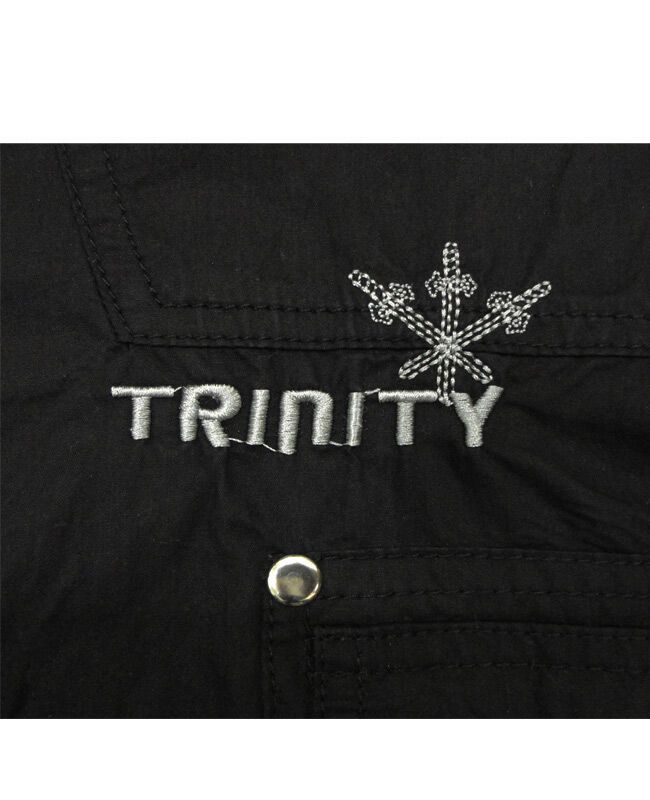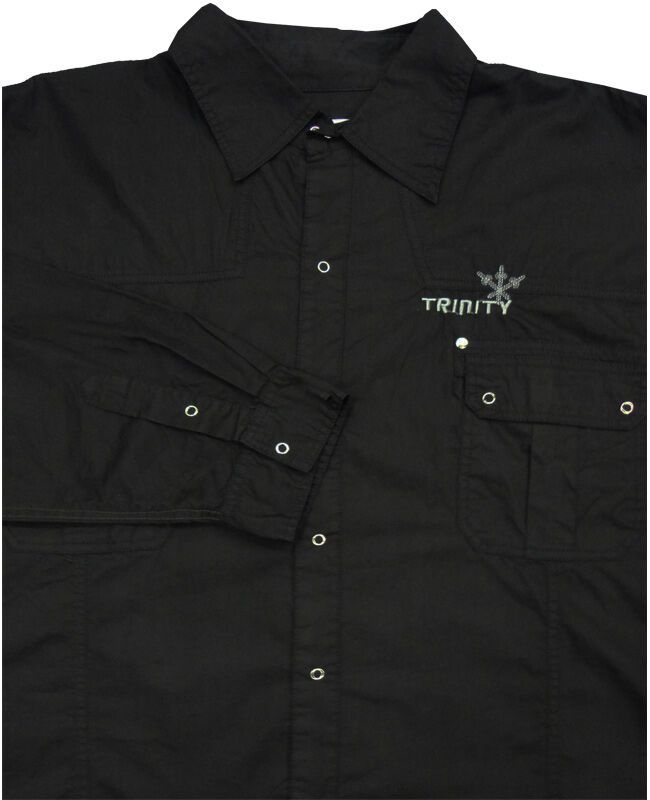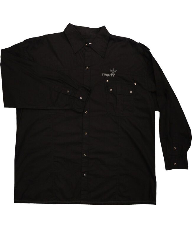 Charcoal Trinity long sleeve button up shirt with collar attached. Small logo print on chest and large print on back. Epaulettes and two pockets. Made of 100% Cotton.