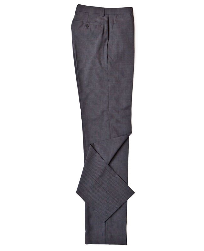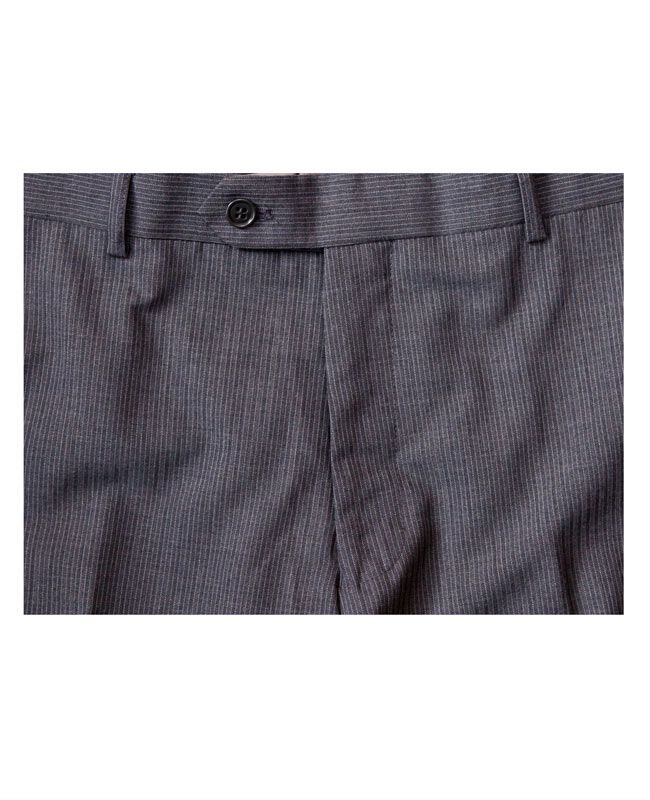 Flair pinstriped tall flat front trousers with french bearer, zip fly, belt loops, hidden fob pocket in waistband and four pockets. Made of 51% Wool / 49% Polyester. Inside leg measures 38" (97cm)