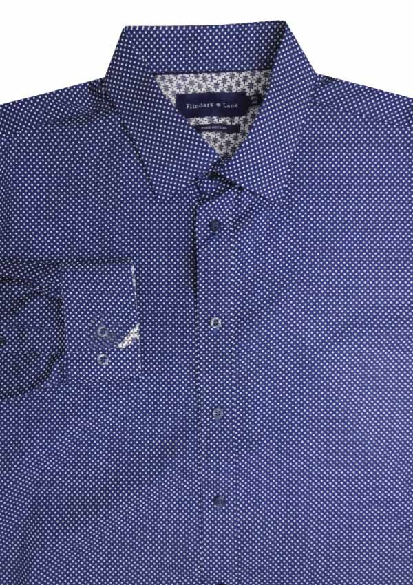 Flinders Lane dot print long sleeve shirt. With button collar and contrast pattern inside cuffs. Made of 100% Cotton.