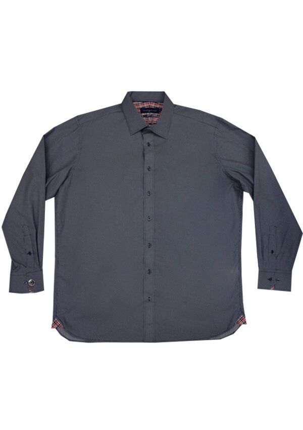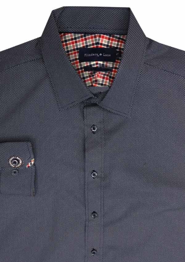 Flinders Lane Pindot long sleeve shirt with checkered pattern inserts on inside of cuffs, collar and hem. Will fit cufflinks. Made of 100% Cotton.