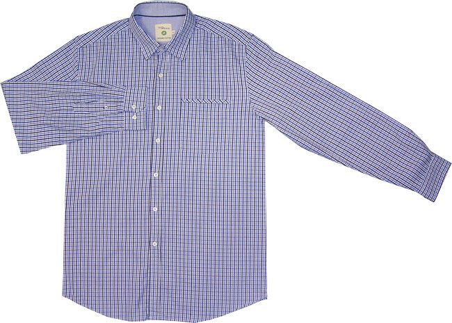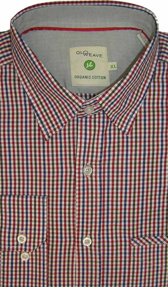Gloweave Ginham check long sleeve shirt with collar and pocket. Made in 100% cotton.