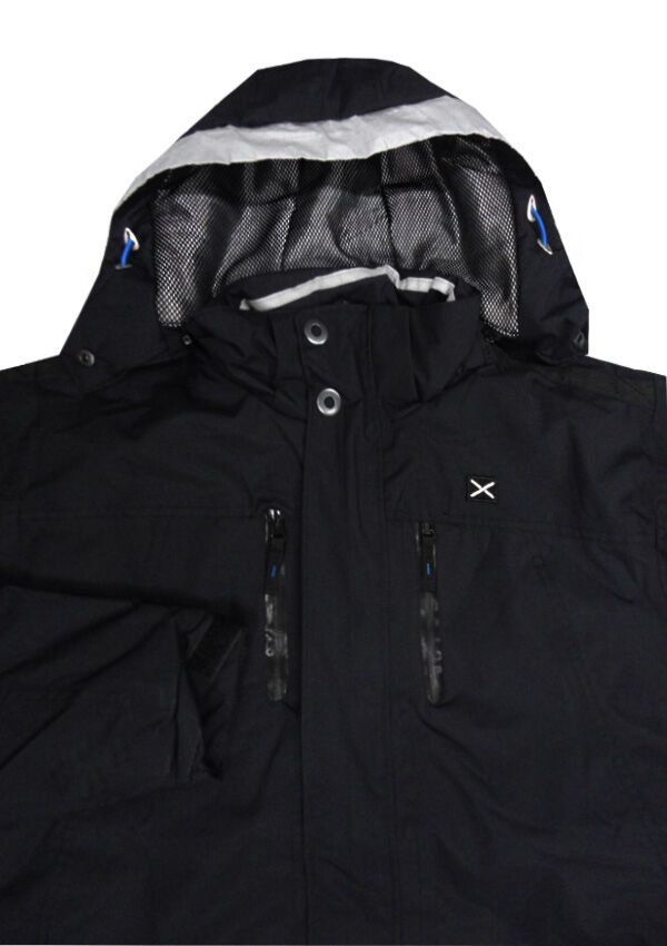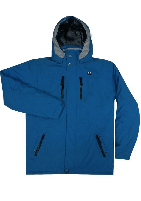 Greyes Technical jacket.  Will full front zip with clip-up buttons.  Four external pockets.  Two internal pockets.  Detachable hood.  Velcro cuffs.  Wind and waterproof material.  Insulated inside.  Shell made of 100% Nylon.  Lining and Padding made of 100% Polyester.