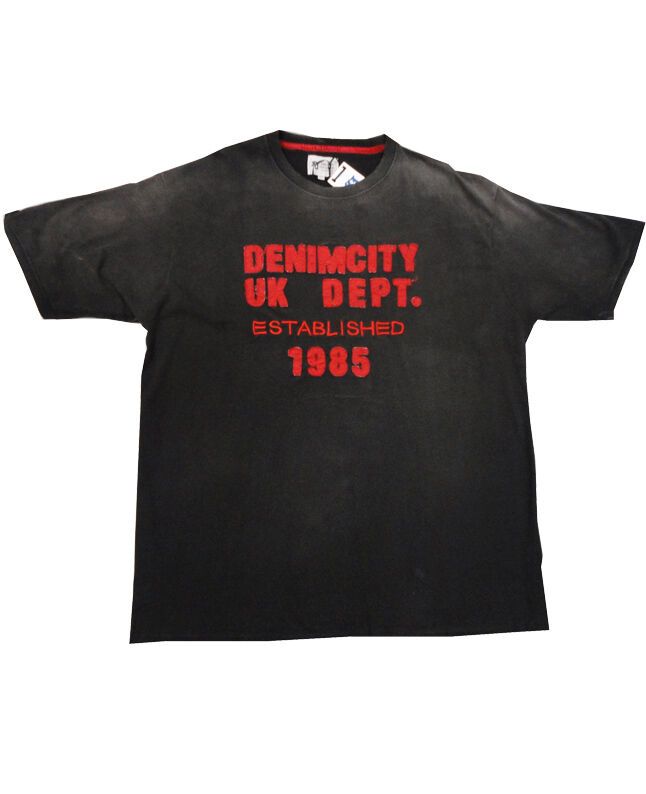 Kam denim city t-shirt with full chest logo. Vintage worn style material along cuffs and collar. Made of 100% cotton.