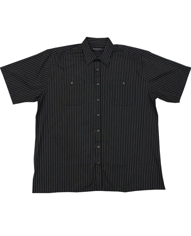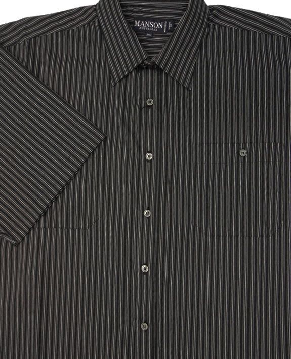 Manson classic fit, short-sleeved, vertical stripe pattern shirt with two top pockets and button collar. Cotton/polyester blend.