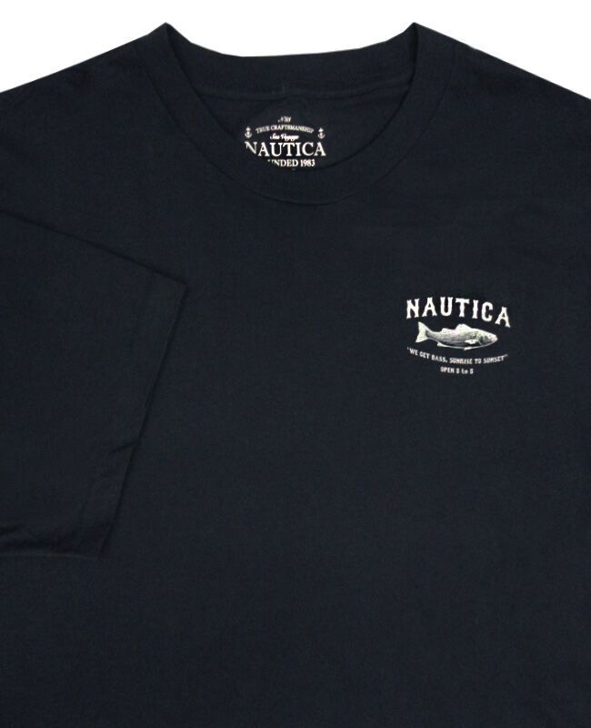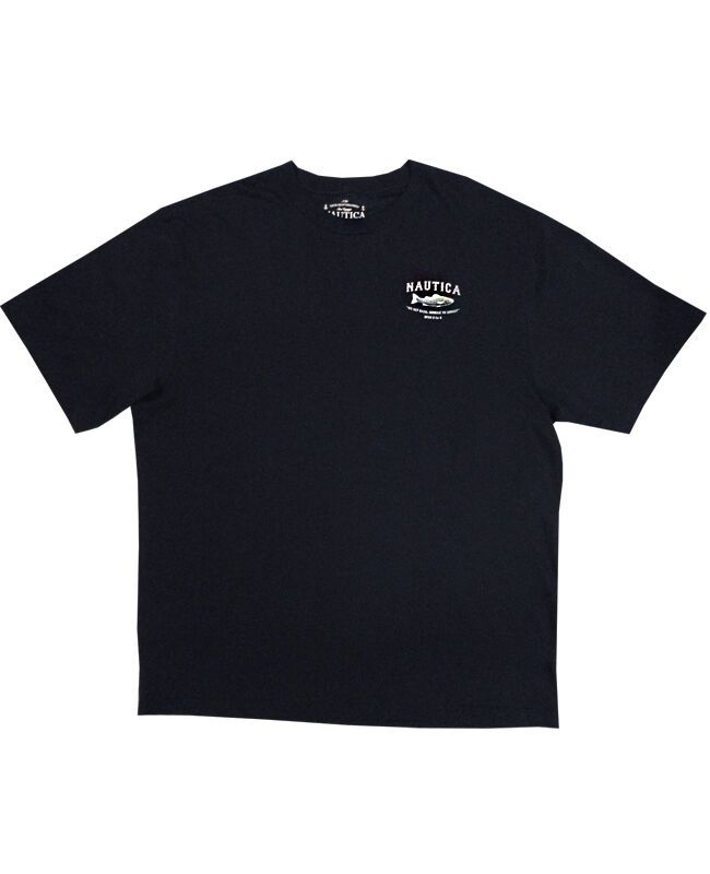 Nautica Bass t-shirt with small chest print on front and large print on back. Made of 100% Cotton.