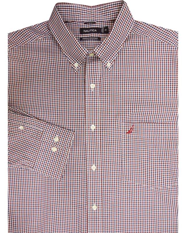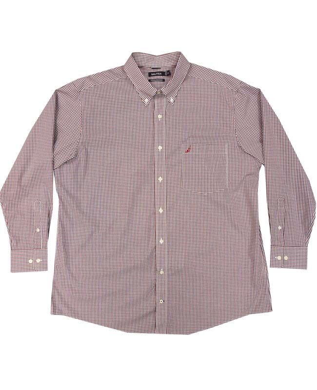 Nautica ginham long sleeve button up shirt with button down collar and single chest pocket. Made of 100% Cotton.