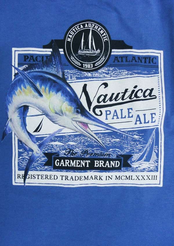 Nautica Marlin t-shirt with large print on back. Classic fit. Made of 100% Cotton. Full chest measurements are as follows: XOS = 120cm 2X = 130cm 3X = 140cm 4X = 148cm 5X = 160cm 6X = 168cm