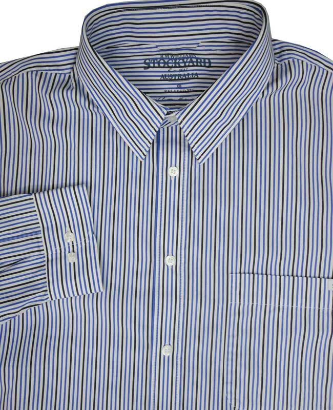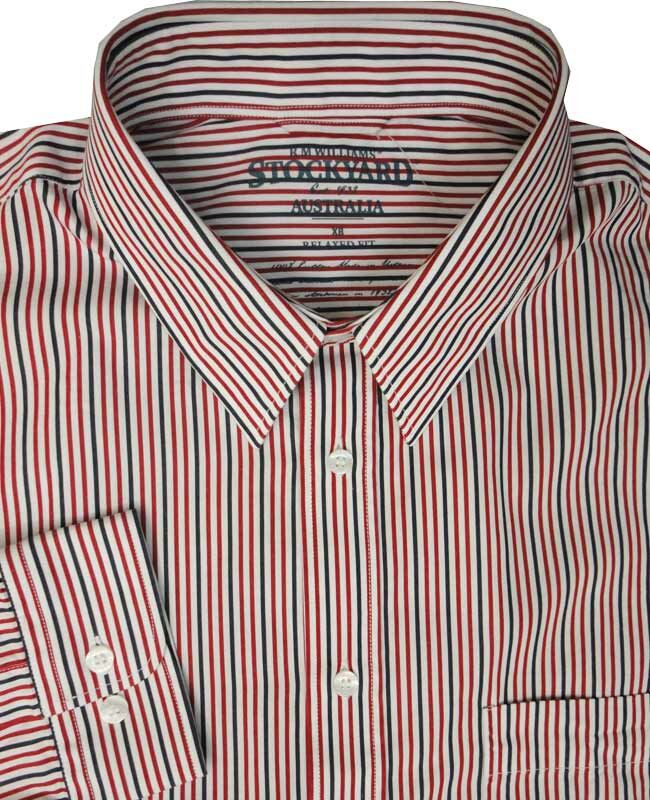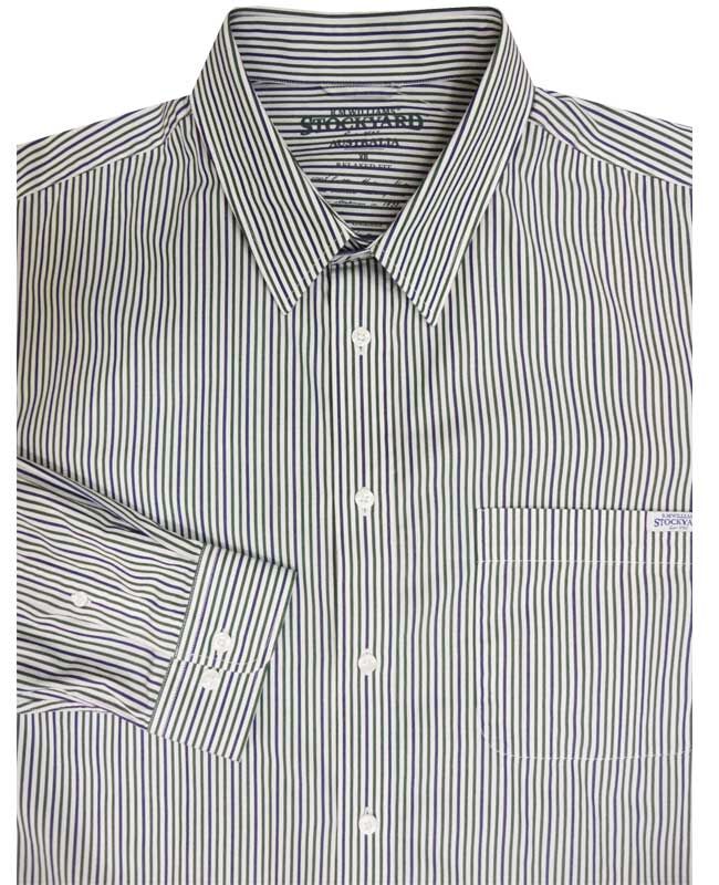 R M Williams Blayney long sleeve shirt with single chest pocket. Features a blue and green vertical stripe. Made of 100% Cotton.