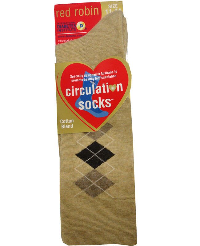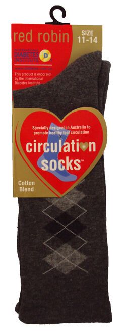 Red Robin sports sock promotes healthy blood flow by having no elastic in the top of the sock and a wide band of support throughout it. Other features of the sock include a fine toe seam to minimize irritation and cushioned sole the provides extra foot comfort and protection. Quality Aussie made form natural fibers, softness and absorbency combined with long wearing characteristics. THESE SOCKS ARE ENDORSED BY THE INTERNATIONAL DIABETES INSTITUTE.