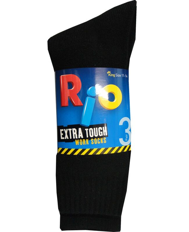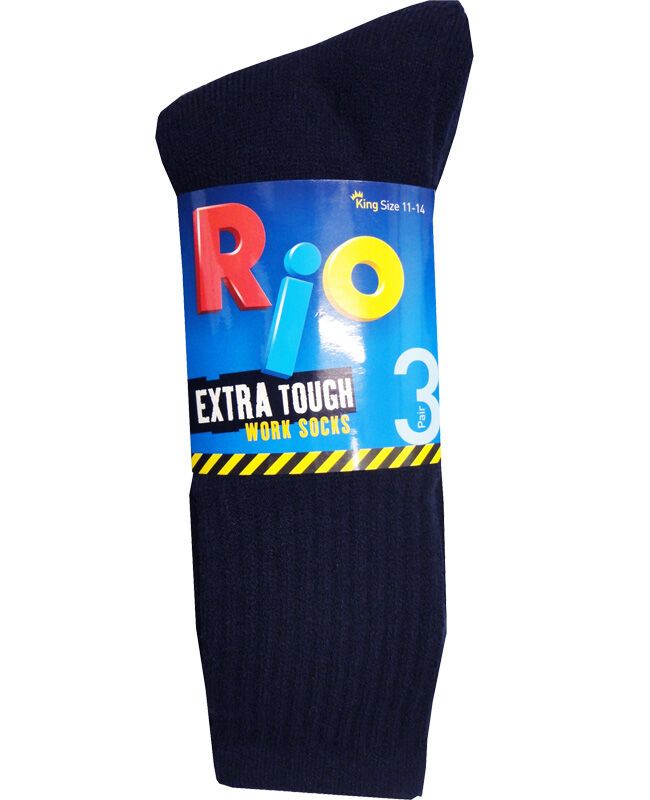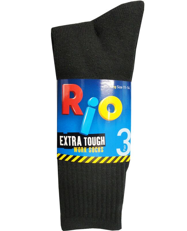 Rio 3 pack plain work socks. Extra tough. Size 11-14. Assorted colors. Black, Navy or Charcoal. Acrylic/ Polyester.